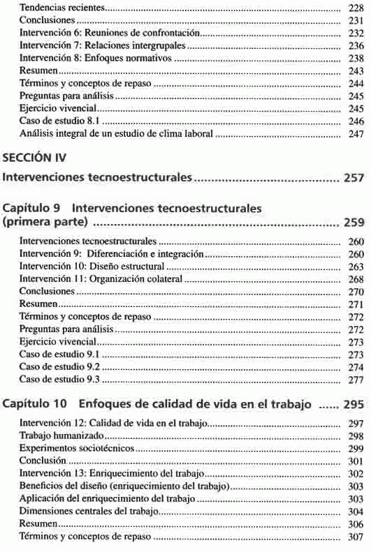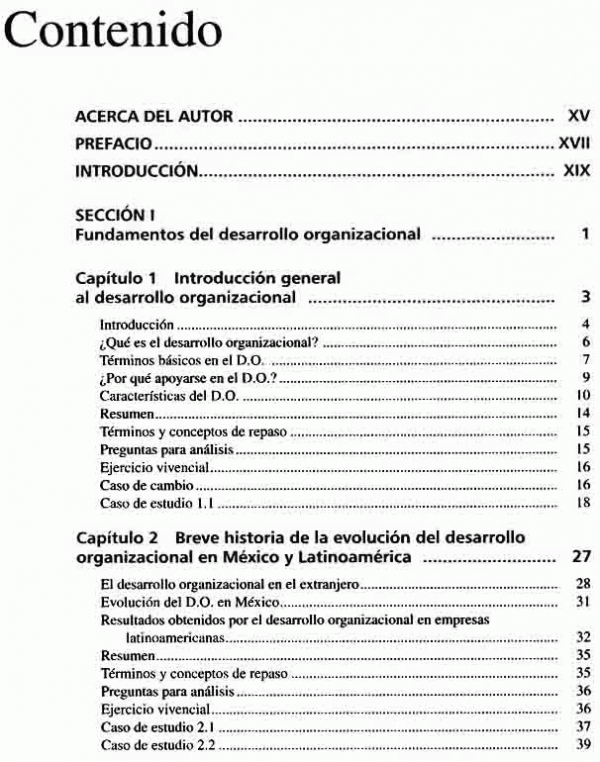 En el libro se analiza: - Los fundamentos del desarrollo organizacional. - La historia del desarrollo organizacional en latinoamericano. - Las principales intervenciones clásicas del cambio a nivel individual, grupal y organizacional. - El novedoso campo de la llamada transformación organizacional (TO).