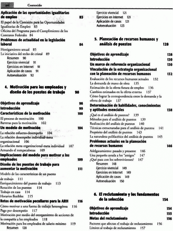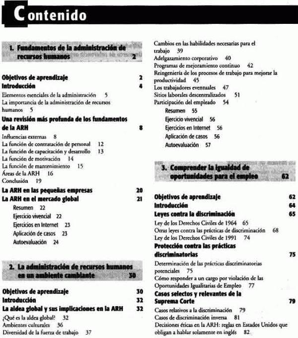 Conceptos básicos de la ARH; se tratan tópicos muy novedosos en este campo como: diversidad de la fuerza laboral, trabajo a distancia, participación del empleado, acosos sexuales, adelgazamiento o reingeniería de la organización, trabajo en equipo, diseño de puestos.