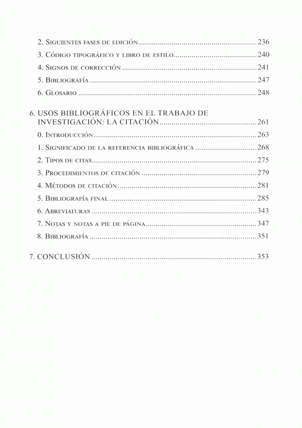 Ofrece pautas para su elaboración , corrección ortográfica, sistemas de clasificación de bibliotecas, herramientas electrónicas para la búsqueda bibliográfica, así como un minucioso ejemplo de cómo enfrentarse a la citación de toda clase de documentos