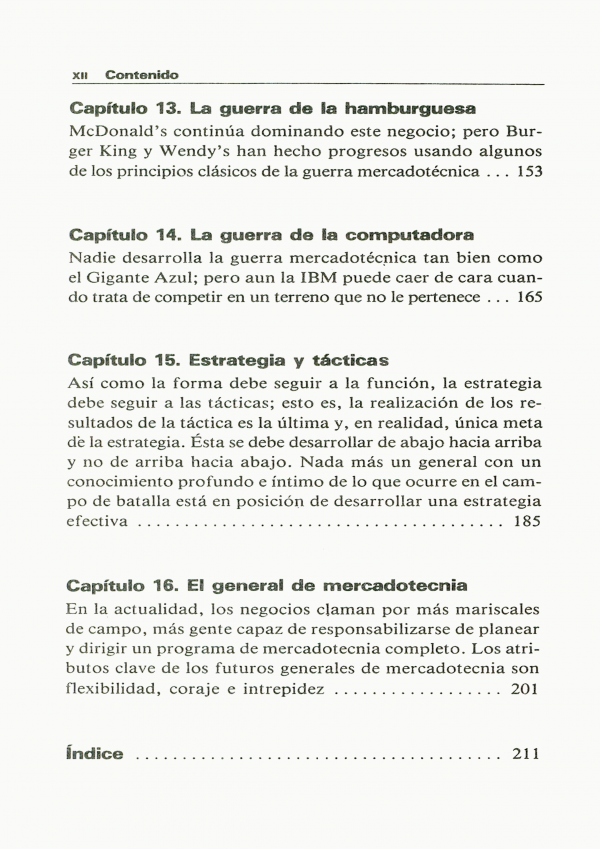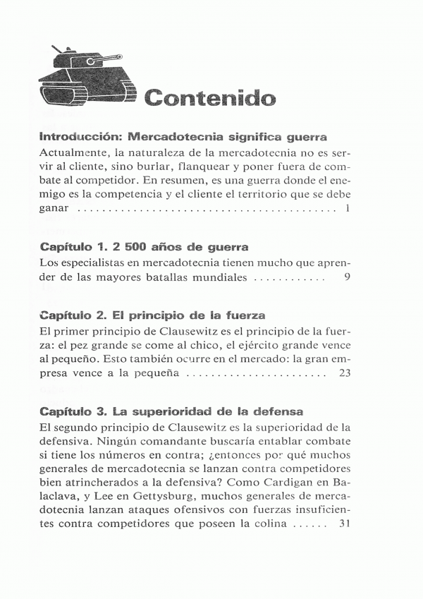 Analiza la mercadotecnia como guerra hacia la competencia, asimilándolo al lenguaje bélico de táctica y estrategia. Ofrece una nueva orientación hacia el consumidor y un paralelo con conocidas batallas.