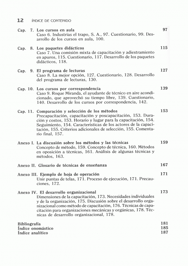 El propósito de esta obra es auxiliar a las organizaciones para que promuevan la calidad a través de la capacitación y el desarrollo de los recursos humanos. Aquí se analizan diversos métodos para llevar a cabo cursos de capacitación y desarrollo, como inducción u orientación, paquetes didácticos, adiestramiento en el puesto, reuniones de trabajo, cursos de correspondencia, programas de lectura, rotación de puestos.