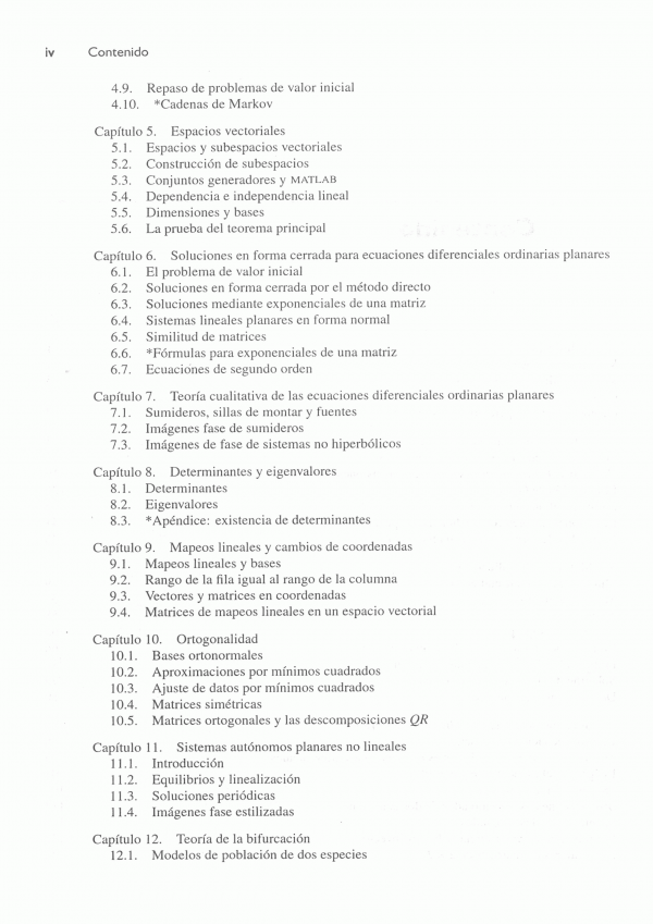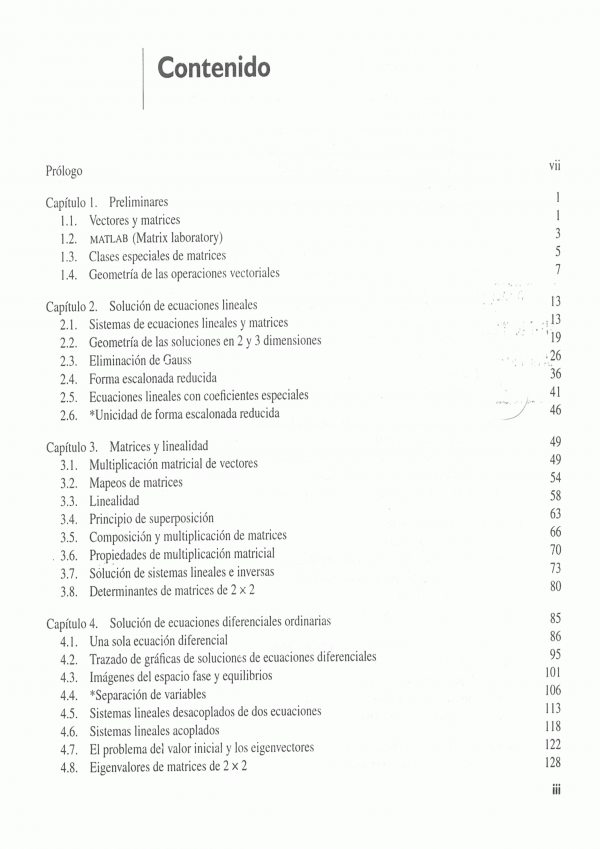 Es una obra en español sobre los temas que se vale totalmente de MATLAB para la solución de problemas. el libro cubre los cursos de álgebra lineal y ecuaciones diferenciales impartidos en todas las ingenierías, en las carreras de matemáticas y en ciencias. ademas del uso del software mencionado, las principales características que hacen diferente a este libro.