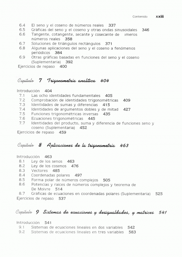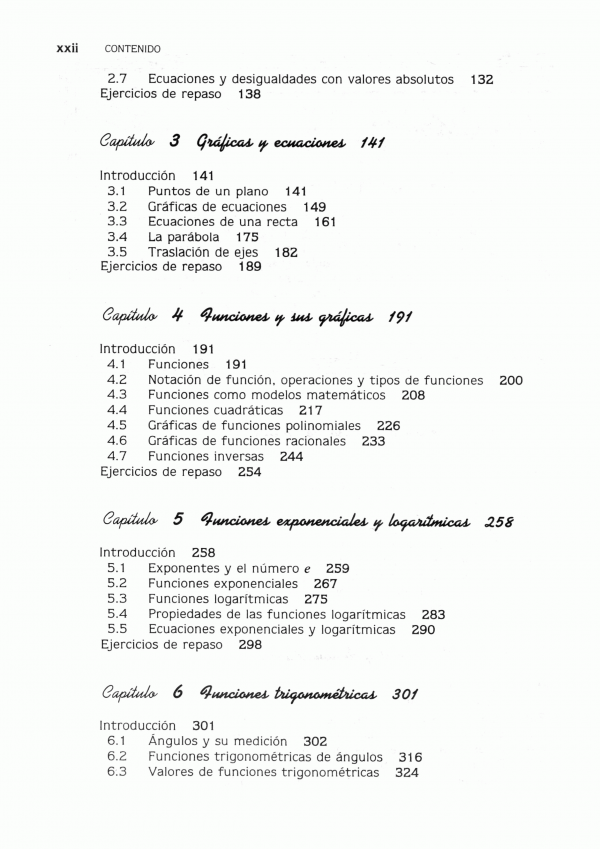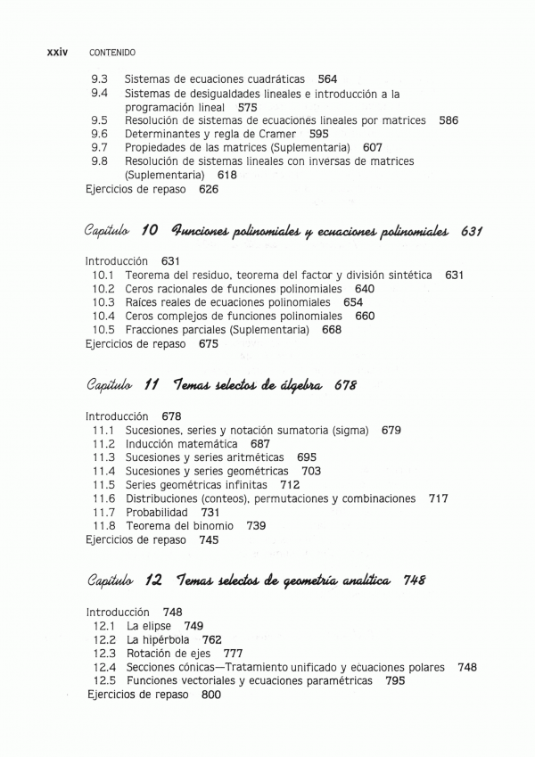 Esta obra el autor expone con la claridad, temas correspondientes a las tres áreas básicas de las matemáticas: álgebra (capítulos 1 a 5), trigonometría (9 a 11) y geometría analítica (capítulo 12). El libro incluye más de cinco mil quinientos ejemplos, los cuales sirven de modelo, para que el estudiante comprenda, cómo debe resolver los ejercicios, qué se plantean en cada capítulo (la respuesta a los ejercicios con numeración impar vienen al final de la obra). Además, en la parte final del texto, incluye tablas logarítmicas, tanto naturales como comunes, así como funciones exponenciales y trigonométricas, con un mismo enfoque expositivo y un mismo método pedagógico.