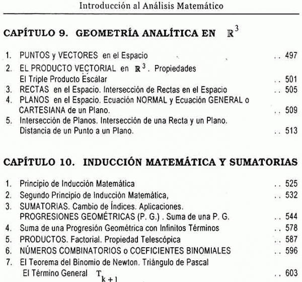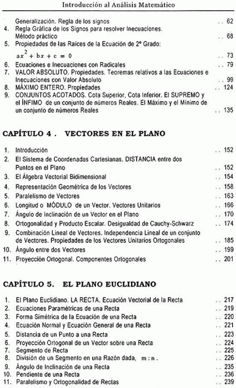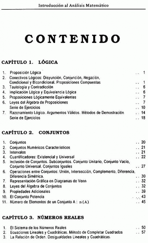 Aborda temas como los fundamentos de análisis matemático, lógica, conjuntos, el sistema de números reales, valor absoluto, máximo entero, conjuntos acotados e introducción matemática y sumarios.