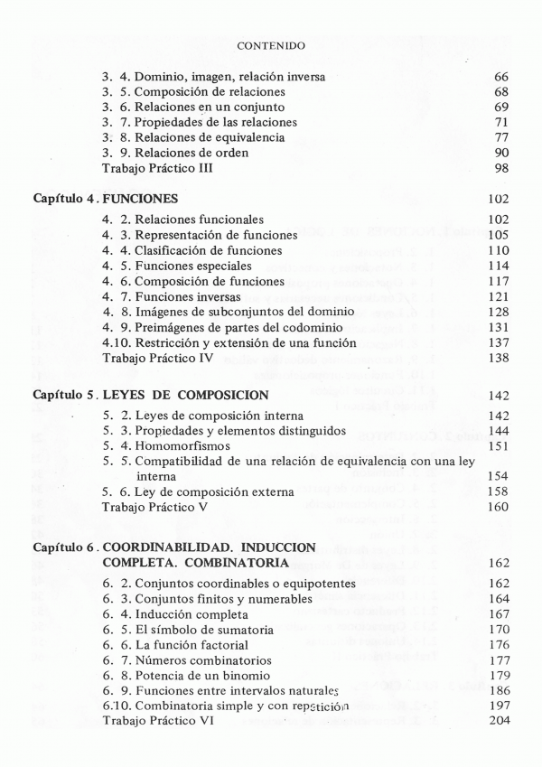 Aborda temas nociones de lógica, relaciones, funciones, leyes de composición. coordinabilidad, sistemas axiomáticos, estructura de grupo, estructuras de anillo y de cuerpo, enteros y racionales...