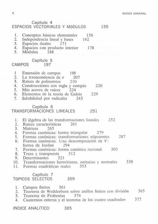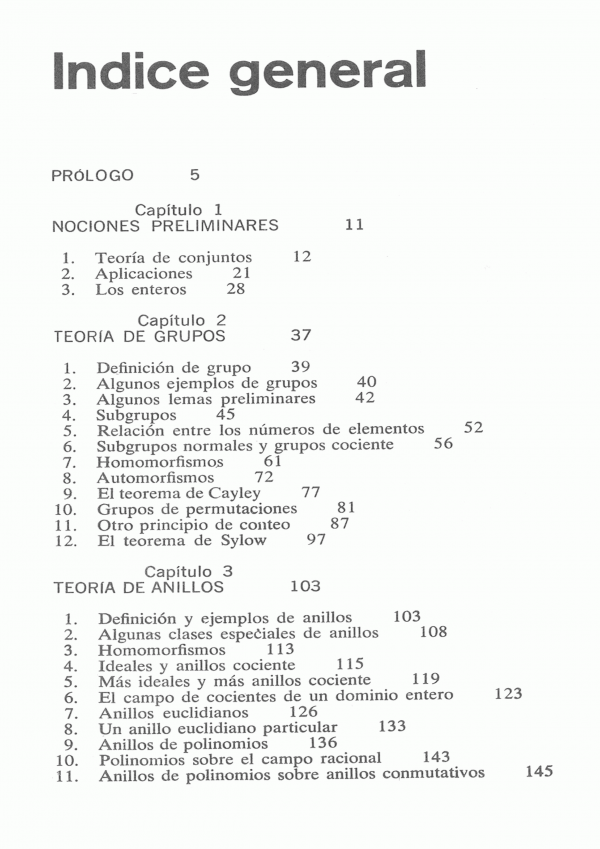 La presente obra ha sido pensada como una introducción a la parte de las matemáticas que se conoce como "álgebra abstracta". Se ocupa de la introducción y desarrollo de sistemas algebraicos importantes como grupo, anillos, espacios vectoriales, campos, etc.