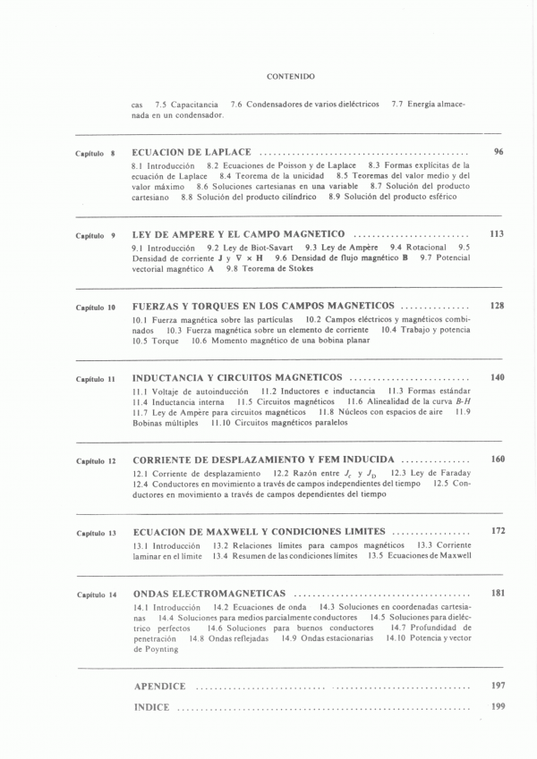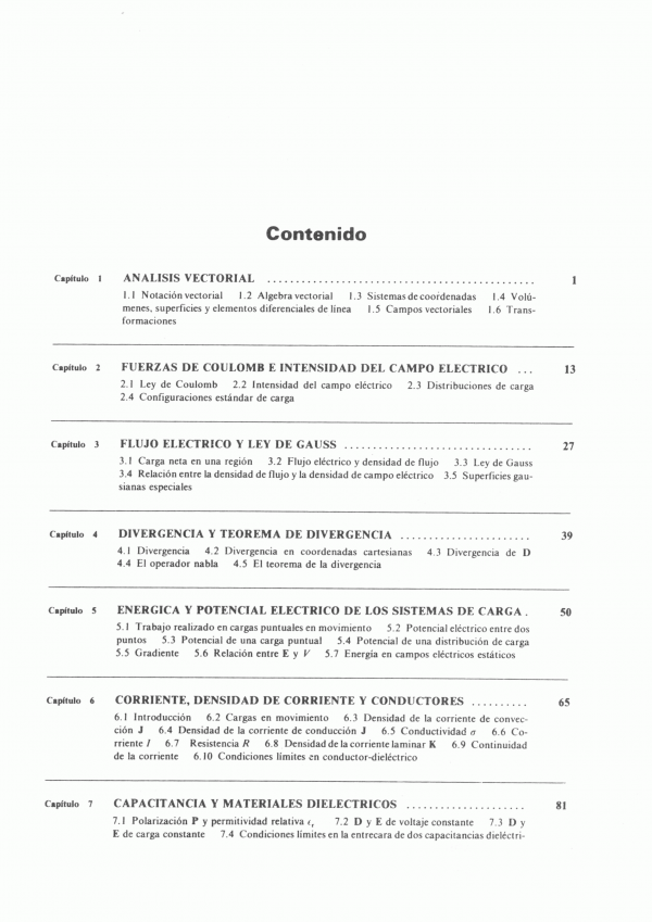 Entre los principales temas estudiados en esta obra están: análisis vectorial, flujo eléctrico y ley de Gauss, divergencia, sistemas de carga, corriente, capacidad, ecuación de laplace, ley del ampere.
