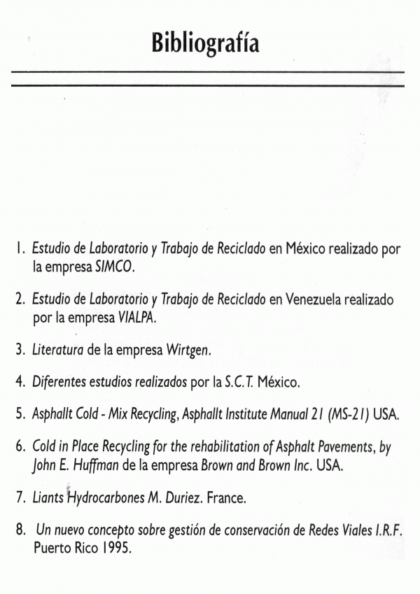 Breve obra sobre el reciclado de pavimentos con emulsiones asfálticas, alternativa para la conservación y rehabilitación de redes de caminos ya construidos que implica, entre otras, las siguientes ventajas: el material pétreo existente en los pavimentos se reutiliza; desde una perspectiva ecológica, es favorable que no hayan de triturarse o extraerse nuevos materiales pétreos; el asfalto en el pavimento se recupera en cuando menos un 50 por ciento; tanto el período de construcción como los gastos administrativos son menores y se elimina el transporte de materiales pétreos a la obra.