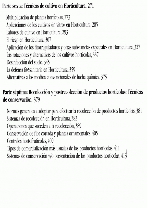 Sobre los cultivos hortícolas, se abordan de forma preferente y amplia todos los aspectos específicos del manejo hortícola bajo diversas protecciones climáticas, como los cultivos sobre acolchados y las producciones hortícolas forzadas bajo túneles y invernaderos con una extensa referencia la control climática de estos últimos .