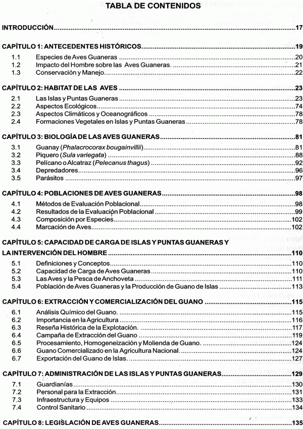 "Conservación y Manejo de las Aves Guaneras" es una obra que documenta el registro y mapeo conociéndose de esta manera la disponibilidad de los yacimientos de guano existentes. El conocimiento del estado, situación y ubicación de estas aves es la base que permite el planeamiento para un mejor aprovechamiento del guano.