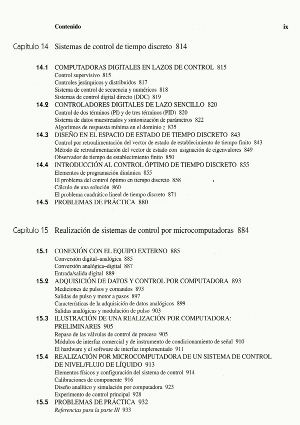 Este libro reine los temas para los cursos de dinámica de sistemas (o sistemas dinámicos) y controles automáticos; presenta numerosos ejemplos de muy diversas áreas de la ingenieria como mecánica, eléctrica, electromecánica, fluidos y química. Ademas de toda esta diversidad, otra de las ventajas que ofrece el autor esque recoje las nuevas formas de enseñanza del control, esto es, lleva a la par sistemas continuos y discretos de una sola entrada y una sola salida, así como sistemas multivariables y control por multilazos.