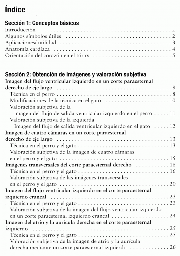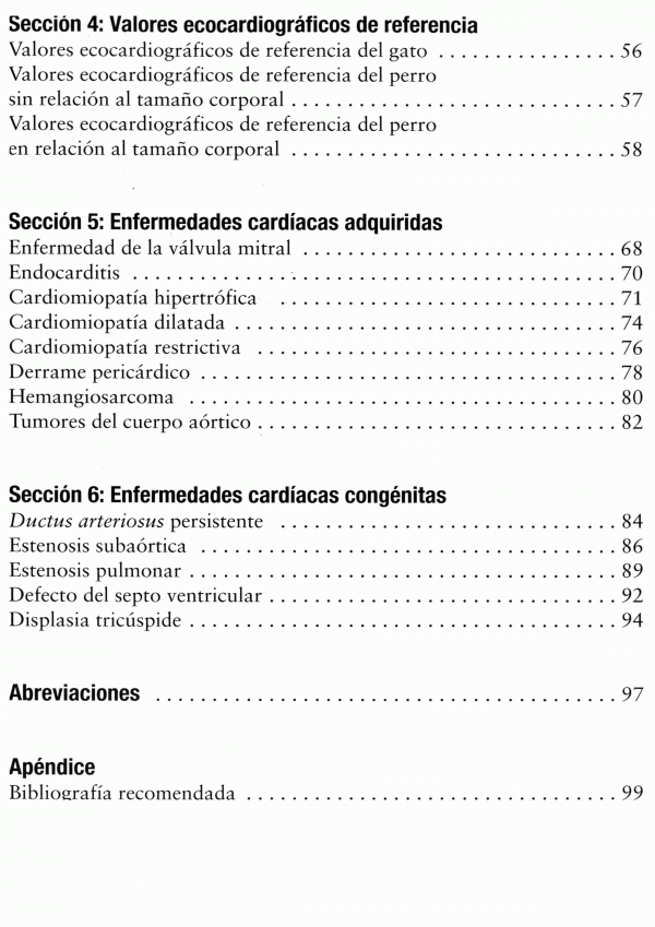 Claras explicaciones para poder obtener los diferentes cortes ecocardiográficos, directrices para la valoración de ecocardiogramas en dos dimensiones y en modo, tablas con los valores ecocardiográficos de referencia del perro y el gato.