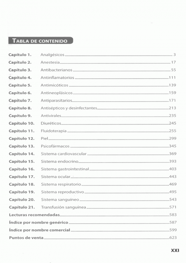 Incluye lecturas recomendadas / Índice por nombre genérico / Índice por nombre comercial / Puntos de venta