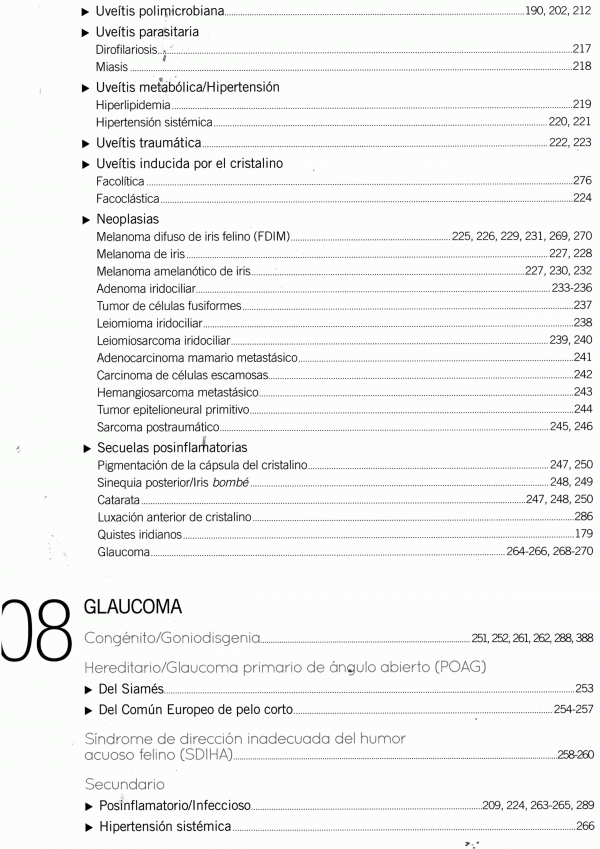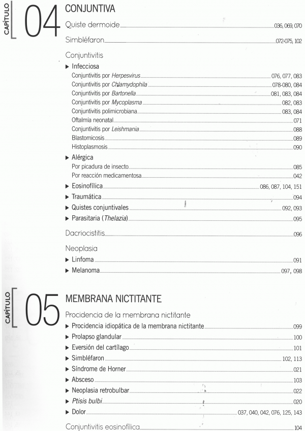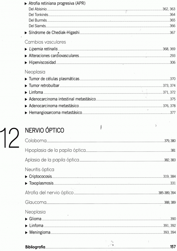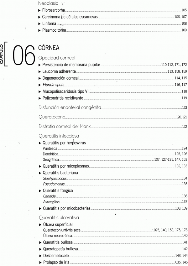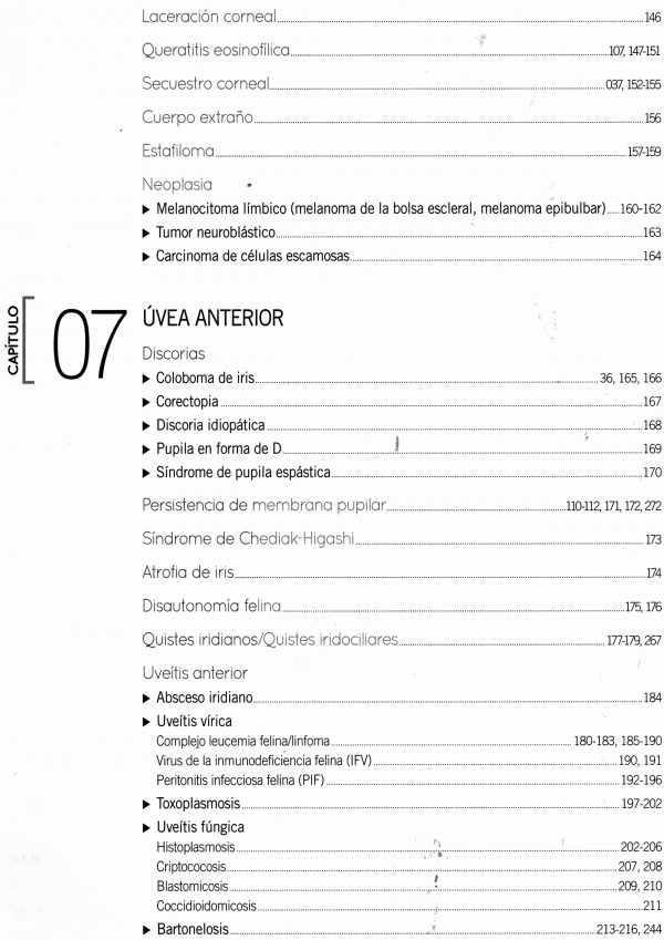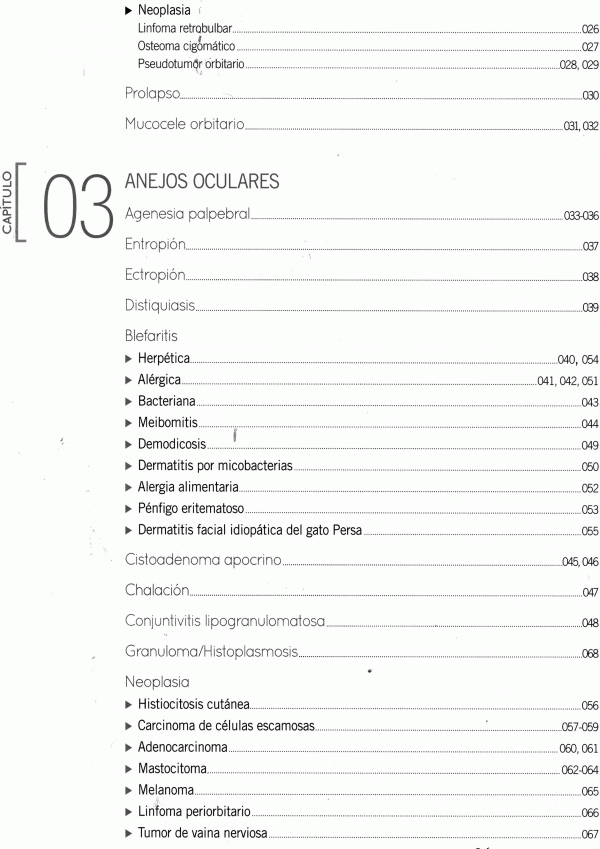 El capitulo se ha dividido en capítulos en función de la estructura anatómica del ojo afectado, Ademas, incluye una ilustración de predisposiciones racionales a distintas enfermedades oculares, así como un indice donde se agrupen las distintas afecciones según su etiologia.