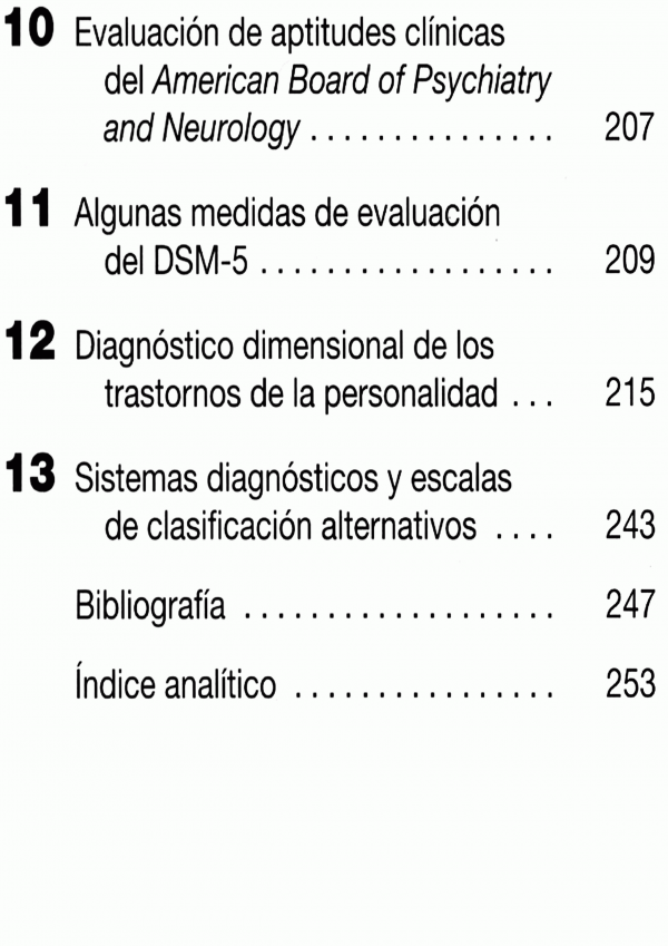La obra, que comienza con una introducción al examen diagnóstico, explica sus objetivos, aporta una estructura eficiente para aprender a realizarlo, repasa las preguntas de criba y, por último, aborda la manera en que el DSM-5, con su enfoque actualizado del diagnóstico y la clasificación, influye en el desarrollo de la evaluación, Además, en ella se analizan las diferencias que presenta el DSM-5 respecto al DS M-IV (y DSM-IV-TR). El capitulo dedicado a la evaluación diagnostica del DSM-5, Núcleo principal de la guía, acompaña al lector a través de una exploración diagnostica completa que incluye preguntas de seguimiento para cada una de las categorías diagnostica contenidas con el DSM-5.