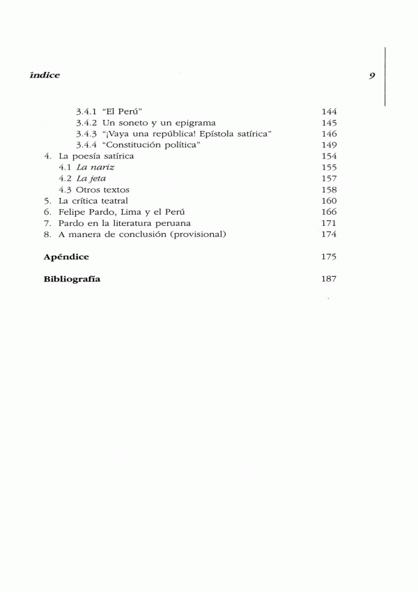 | 808.1 / B85 Poemas Escogidos / [Impreso] | 808.1 / C28 Testimonio de Invierno / [Impreso] | 808.1 / C75 Poesía, 1967-1980 / [Impreso] | 808.1 / C78 Felipe Pardo y Aliaga el Inconforme / [Impreso] | 808.1 / C78 En la Mitad del Camino Recorrido / [Impreso] | 808.1 / C78 Sonetos del Viejo Amador / [Impreso] | 808.1 / C85 El Animal Favorito / [Impreso] |
