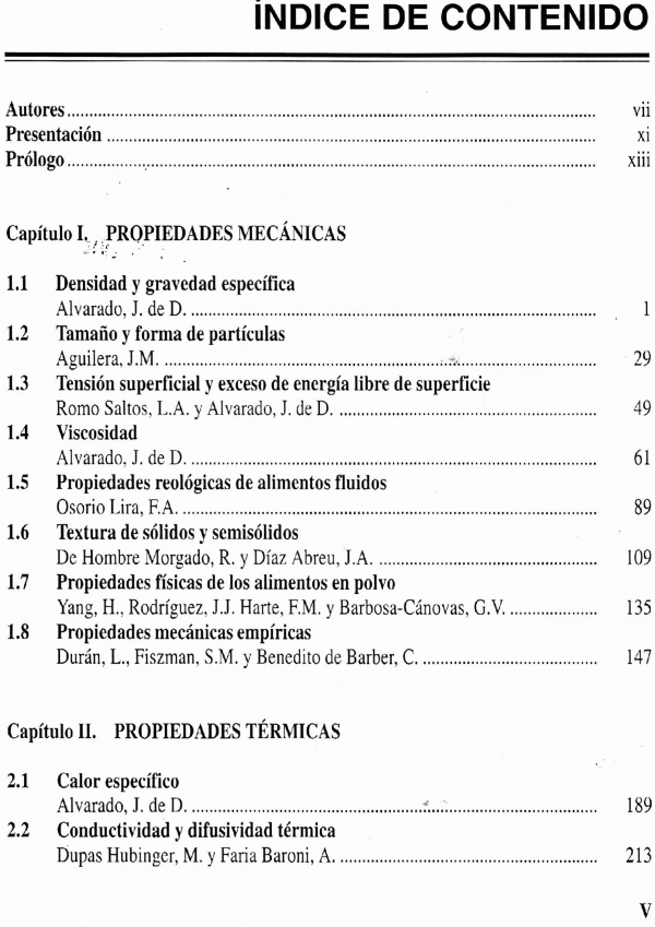El contenido del libro esta dividido en cinco capítulos , cuatro de ellos tratan de las propiedades físicas, según la división clásica de la física; el restante se refiere al uso de herramientas estadísticas que son indispensables para la obtención de datos fiables para su correcta utilización.