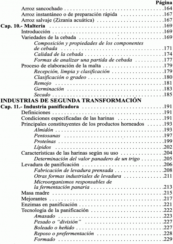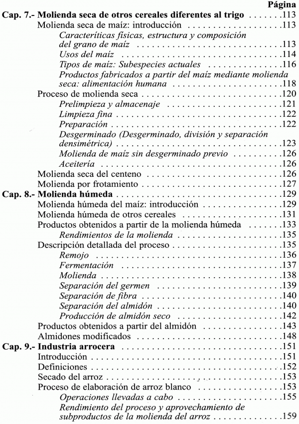 Es una obra de carácter fundamentalmente didáctico que, a través de las tres partes principales en las que se ha estructurado aborda el estudio de los aspectos generales de granos y harinas, las industrias de primera y segunda transformación de los cereales.