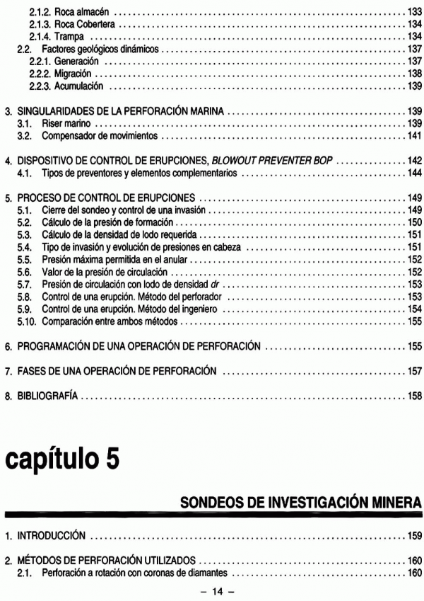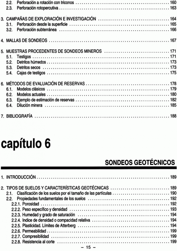 Fundamentos y bases geológicas.- Aplicaciones informáticas en la representación y tratamiento de sondeos.- Sondeos para captación de aguas.- Sondeos de petróleo y gas.- Sondeos de investigación minera.- Sondeos geotécnicos.- Sondeos de drenaje de grisú en yacimientos de carbón.- Sondeos para la clasificación subterránea del carbón y destilación.- Sondeos para extracción de minerales in Situ. Aprovechamiento de cavidades subterráneas.- Sondeos geotérmicos.- Sondeos para la consolidación de terrenos.- Sondeos de inyección para la eliminación de residuos.- Sistemas de contratación de sondeos