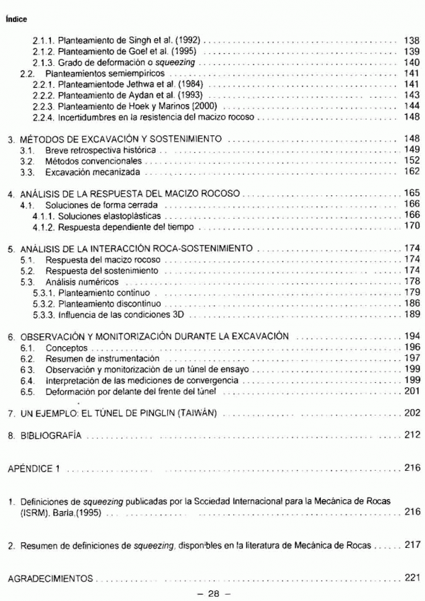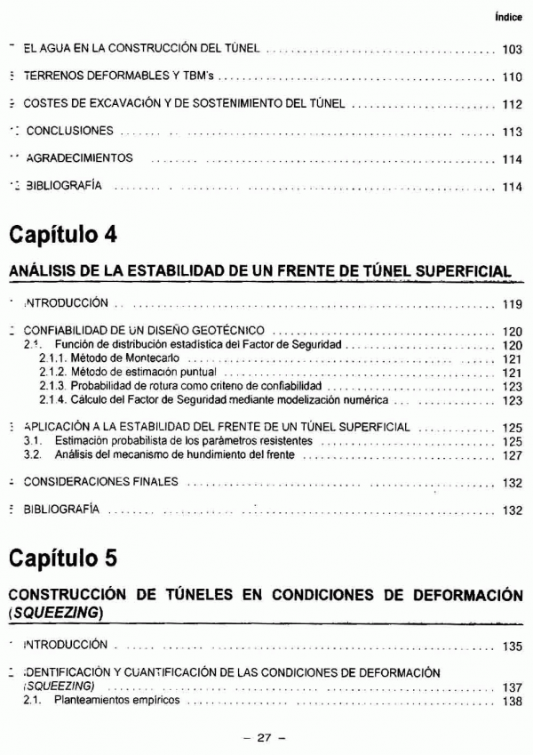 CONTENIDO: Nuevas tendencias en la caracterización del macizo rocoso y en el diseño y construcción de túneles.- La clasificación como herramienta en la ingeniería de rocas.- Grandes túneles en roca débil.- Análisis de la estabilidad de un frente de túnel superficial.- Construcción de túneles en condiciones de deformación (squeezing).- Comparación entre métodos para el cálculo de la fiabilidad en sostenimiento de túneles.- Simulación estadística de una estructura en bloques en 3D – Guía para el diseño de túneles en roca diaclasada.- Caracterización de los terrenos para el proyecto y construcción de túneles carreteros con tuneladora.- Evaluación del riesgo geotécnico como base de la estimación de costes en la construcción de túneles.- Refuerzo del terreno para túneles en condiciones geológicas difíciles.- El rendimiento de excavación con rozaduras – influencias geológicas y geotécnicas.- Novedades en el diseño de tuneladoras de gran diámetro. Problemas a resolver en distintos tipos de terrenos.- Problemas de las máquinas tuneladoras en terrenos acuíferos.- Diseño de voladuras en túneles y galerías.- Tratamiento de arenas sueltas mediante inyecciones de microcemento con microsol en los túneles de Sinesio Delgado (Madrid).- El túnel de Abdalajis ejecutado con TBM en la línea de alta velocidad Córdoba-Málaga.- Túneles reventilación y acceso de viajeros en las estaciones del Metro de Bilbao.- Innovaciones en las obras del Metro de Bilbao: tramo de Sestao-Portugalete.- El túnel de Santa María de la Cabeza: ejemplo de túnel urbano para vehículos.- Dificultades en la travesía con tuneladora bajo la Robla y su resolución.