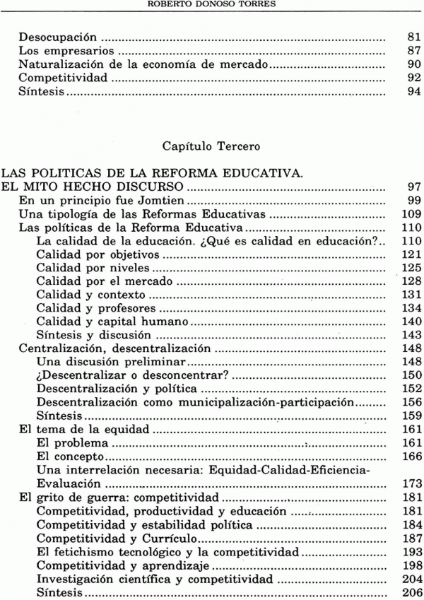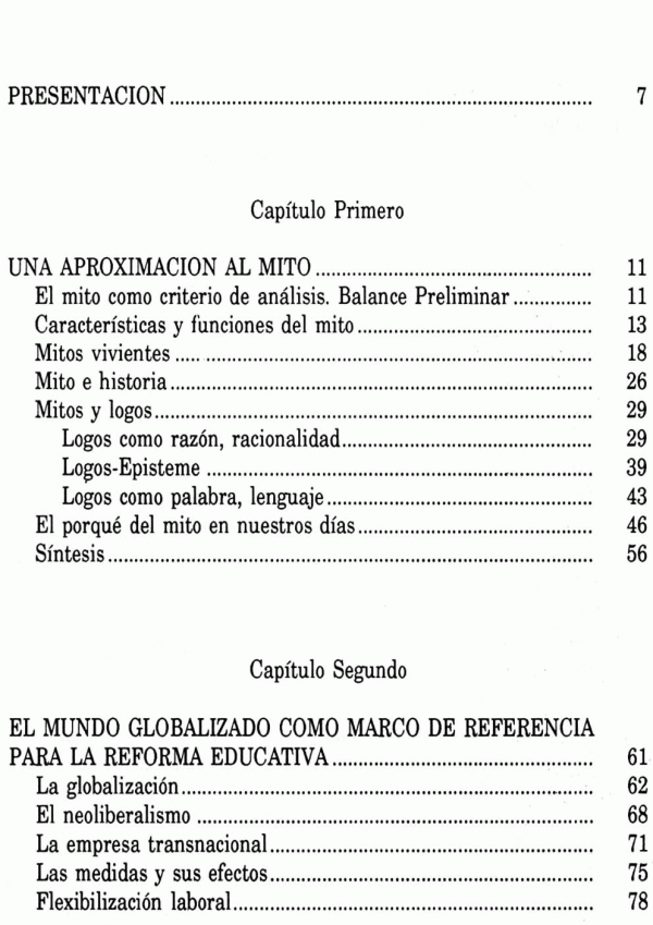 La Reforma Educativa que se desarrolla en las distancias latitudes de nuestro continente el trasfondo común con los requerimientos del crecimiento sustentado en el mercado como eje organizado y meta de la organización social, impone para su despliegue. Así las Políticas Educativas impulsadas especialmente por la banca multilateral- calidad, equidad, descentralizacion, competitividad - se convierten en un gran relato, en un mito que promete a la población esperanzada en días mejores sin que haya razones suficientes y necesarias para admitir que esta posibilidad sea cierta.