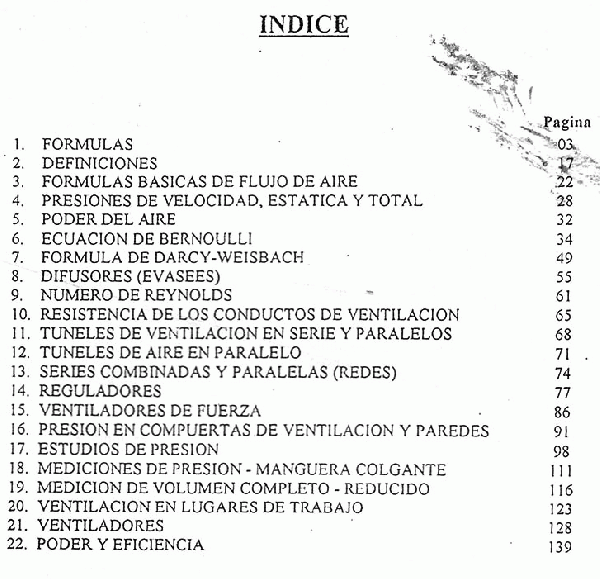 Ventilación para la minería, compilado por Jakes Lock, es un libro que abarca 22 temas desde: Fórmulas, definiciones, fórmulas básicas del flujo de aire, presiones de velocidad, estática.
