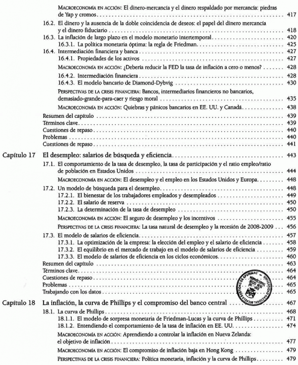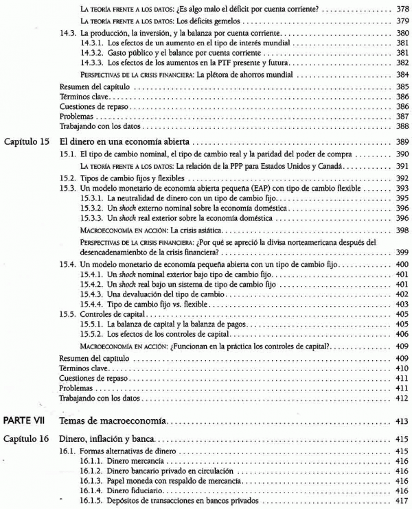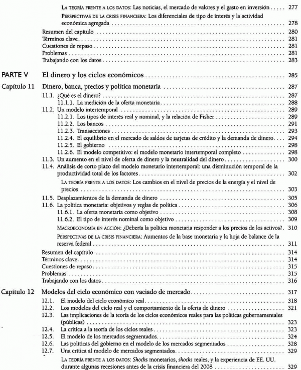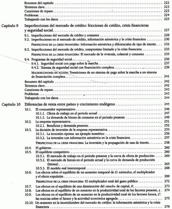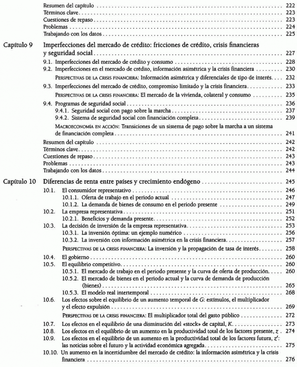 En primer lugar, el libro presenta un tratamiento muy completo de las cuestiones macroeconómicas de mayor relevancia actual: crisis financieras, ciclos económicos y deuda externa. Ofrece un modelo de alcance general (Nuevo Modelo Macroeconómico Keynesiano) que permite el análisis riguroso en un marco formal, tanto de las cuestiones más habituales de la teoría macroeconómica, como puedan ser la determinación de la producción, el desempleo o las políticas fiscales o monetarias, como de las cuestiones más actuales ya mencionadas. En segundo lugar, el texto permite su utilización a varios niveles: desde un nivel intermedio hasta un nivel alto que no exija un tratamiento excesivamente matemático. Esta adaptabilidad del texto permite que se pueda recomendar en una Macroeconomía II, Macroeconomía III o avanzada y en una Macroeconomía de postgrado. INDICE: Parte I. Introducción y cuestiones de medición 1. Introducción 2. Medición 3. La medición del ciclo económico Parte II. Un modelo de un período de la macroeconomía 4. El comportamiento de la empresa y el consumidor: la decisión de ocio-trabajo y la maximización del beneficio 5. Un modelo macroeconómico de un período para una economía cerrada Parte III. El crecimiento económico: Malthus y Solow 6. Economic Growth: Malthus and Solow 7. La disparidad de ingresos entre países y el crecimiento económico Parte IV. Ahorro, Inversión y Déficit Público 8. Un modelo de dos períodos: la decisión de ahorro-consumo y los mercados de crédito 9. Imperfecciones en el mercado de crédito: Fricciones crediticias, Crisis Financiera y Seguridad Social 10. Un modelo real intertemporal con inversión Parte V. Dinero y ciclos económicos 11. Dinero, Banca, Precios y política monetaria 12. Modelos de vaciado de mercado del ciclo económico 13. Nueva economía keynesiana: precios inflexibles Parte VI. Macroeconomía internacional 14. El comercio internacional de bienes y activos 15. El dinero en la economía abierta Parte VII. Temas de macroeconomía 16. Dinero, Inflación y Banca 17. Desempleo: salario de eficiencia y coste de búsqueda 18. Inflación, la curva de Phillips y el compromiso del banco central Apéndice matemático Índice.