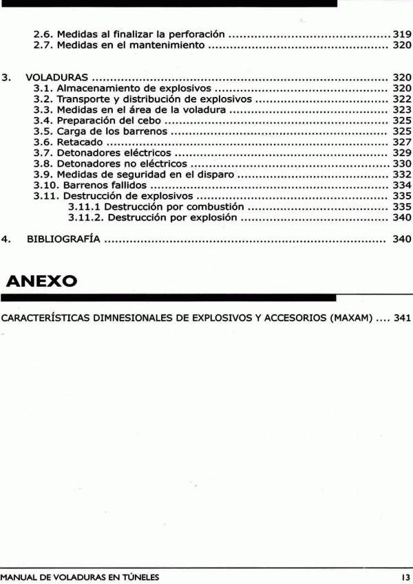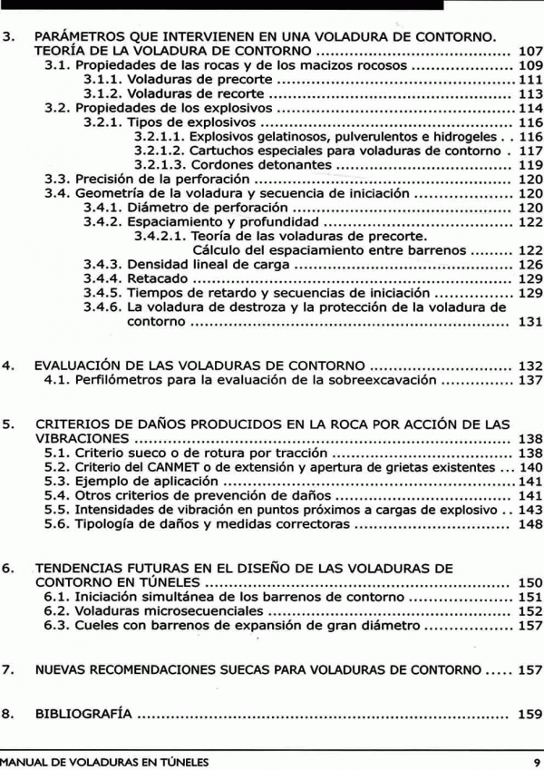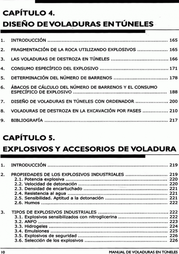 La excavación de túneles con perforación y voladura.- Diseño y ejecución de cueles.- Voladuras de contorno.- Diseño de voladura en túneles.- Explosivos y accesorios de voladura.- Sistemas mecanizados de carga de explosivos.- Vibraciones producidas por voladuras en la excavación de túneles.- Normas de seguridad en túneles.- Anexo: Características dimensionales de explisivos y accesorios (MAXAM)