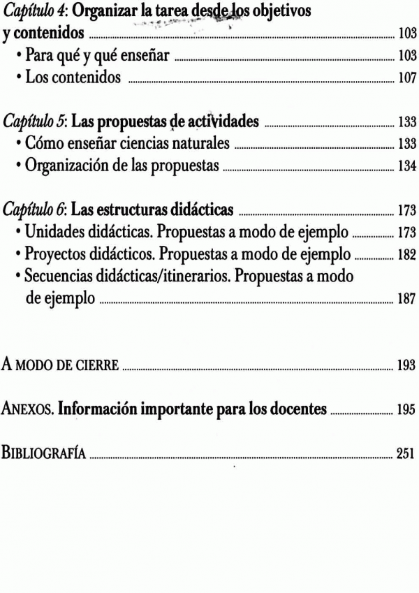 Resumen: Este libro incluye, con extrema profesionalidad y sabiduría, todos los aspectos necesarios para comprender al área de las Ciencias Naturales, sus especificidades en la Educación Inicial y su impronta peculiar en el trabajo con niños pequeños. Al respeto podemos mencionar al menos tres problemáticas de la enseñanza de las ciencias en el Jardín, que seguramente este libro ayudará a desanudar: Una se refiere a que los educadores puedan adecuar las propuestas a las posibilidades infantiles, lo cual implica un esfuerzo extremo y el inmenso conocimiento que caracteriza el recorrido de las autoras de este libro. Otra se vincula con el permitirse como educadores, y permitirles a los alumnos, probar, explorar, experimentar, ensuciarse, moverse…, y esto cuesta mucho más de lo que nos animamos a reconocer. Una tercer problemática, realmente muy importante, se refiere al conocimiento que los educadores debemos tener sobre estas disciplinas para animarnos a incluirlas en nuestras propuestas cotidianas. Por ejemplo, ¿sabemos por qué flotan los objetos? ¿Conocemos verdaderamente sobre el crecimiento de las plantas, la vida animal, como para poder enseñarlo? ¿Qué sabemos sobre magnetismo? ¿Reconocemos la diferencia entre explorar y experimentar en las ciencias naturales? ¿Entre objetos y materiales?