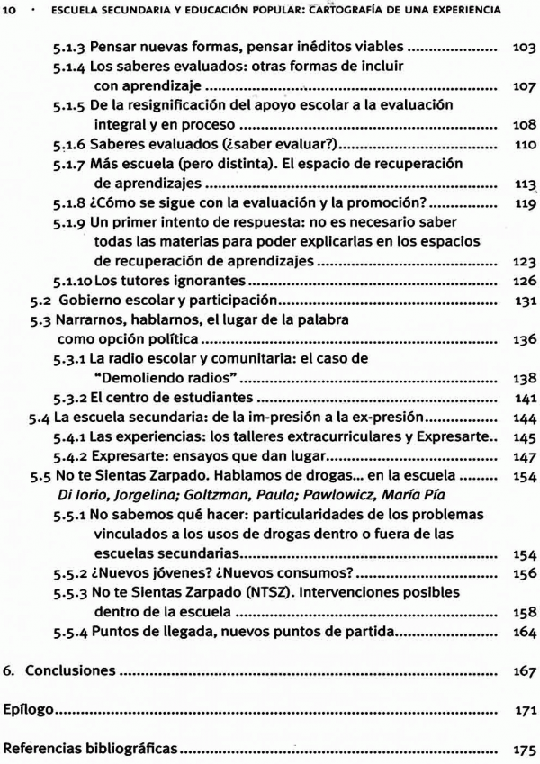 En la escuela analizada se comprende a los jóvenes como protagonistas de su propia vida y como sujetos de derecho. "Se trata de asumir la democracia como forma de ejercicio del poder. La educación popular y la pedagogía crítica imponen la discusión acerca del lugar del educador y de la escuela en torno a las opciones políticas. Para quienes hemos hecho una opción por dar voz a los grupos subalternos, este libro, insisto, es necesario." CARINA KAPLAN