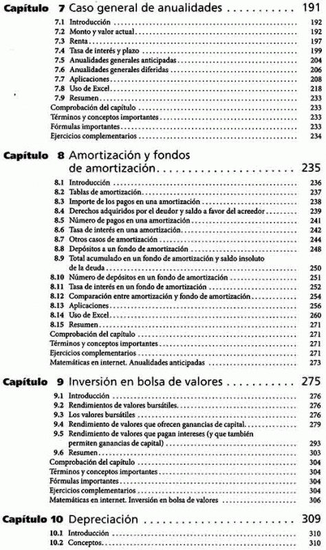 Esta quinta edición conserva el propósito fundamental de presentar las herramientas matemáticas necesarias para evaluar la equivalencia del valor del dinero en diferentes tiempos y circunstancias, de la manera más sencilla y didáctica posible. Mediante su estudio, el lector adquirirá los conocimientos necesarios para comprender cómo se deben manejar cantidades monetarias, así como las variaciones que sufren con el paso del tiempo. Esta nueva edición ha sido revisada y actualizada por los autores, sobre todo en lo que se refiere a la utilización de las tasas de interés vigentes. Sus principales características son: - Resolución detallada de numerosos ejercicios con datos reales que ilustran detalladamente los conceptos relevantes y los procesos de cálculo. - Sección “Uso de Excel®” en todos los capítulos, se desarrollan ejemplos resueltos en el texto con este software. - Sección “Matemáticas en Internet” al final de cada capítulo. - Introducción a las anualidades crecientes, el cual es un tema de especial interés para los planes de pensiones. Sin lugar a dudas, esta obra resulta un material de gran aportación por su estilo claro y sencillo aún en los temas más complejos