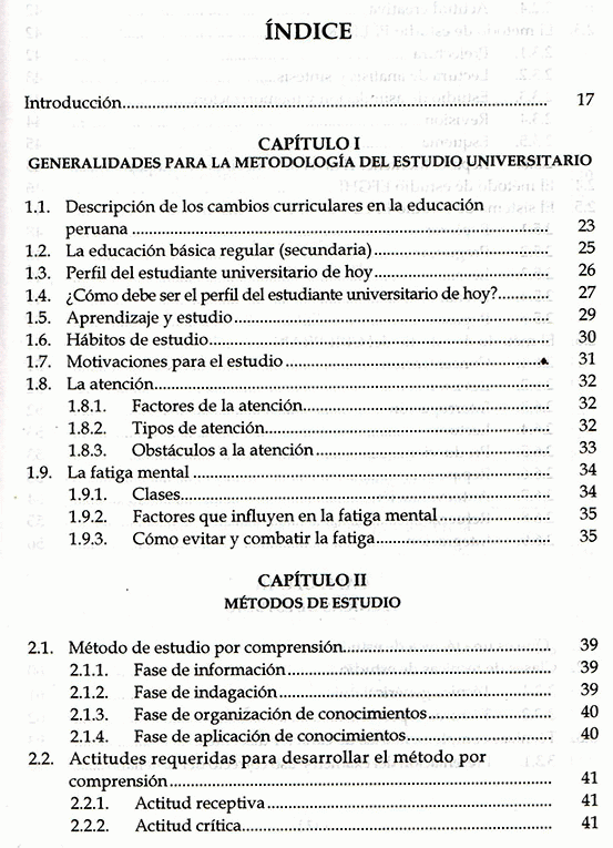 Este libro brinda información sobre la metodología del estudio universitario, cambios curriculares que tuvo la educación peruana y una breve descripción de los problemas que a un existen.