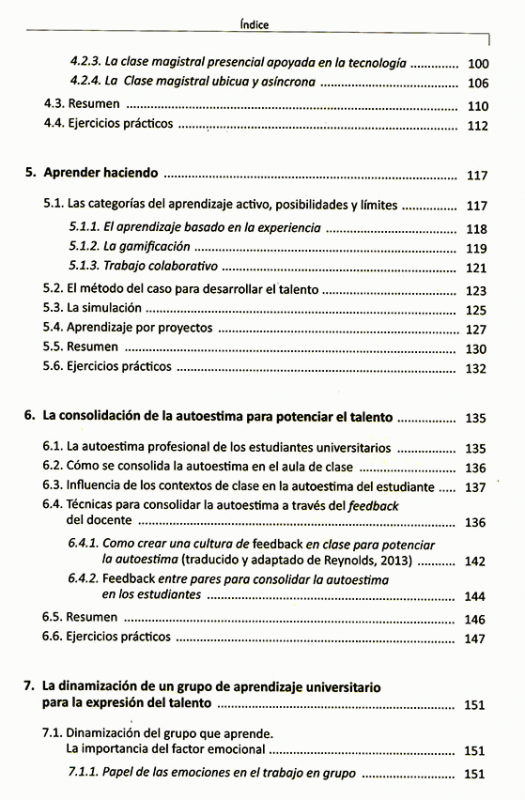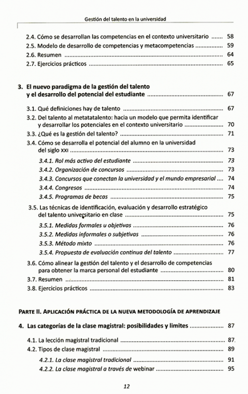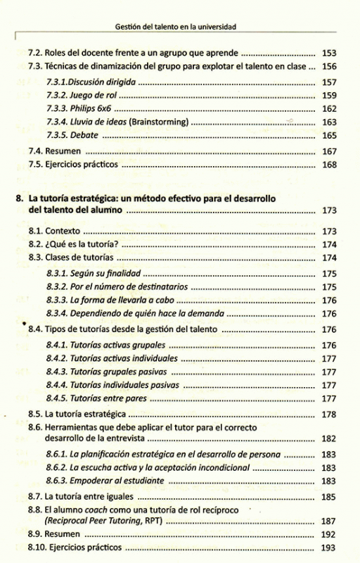 A pesar de los grandes avances de la tecnología, de la innovación docente, del desarrollo de competencias y de todos los esfuerzos de sistematización realizados en el área de la gestión del talento, no se cuenta aún con un marco teórico suficientemente desarrollado para mejorar el potencial del estudiante universitario. La gestión del talento en la universidad no es un asunto de profesores dedicados a la innovación docente, o de la gestión de extraordinarias partidas presupuestarias, sino de seres humanos interesados en optimizar sus prácticas profesionales y dar un valor añadido al rol del docente. Un rol en el que la clase se transforma en un desarrollo estratégico de las competencias profesionales. De esta manera, el docente contribuye a que el alumno identifique, desarrolle y finalmente aplique su talento en el lugar en el que le toque desarrollar su carrera profesional para conseguir una sociedad mejor. Es aquí donde cobra fuerza e importancia el aporte que presenta este libro, que aborda una metodología docente centrada en desarrollar todo el potencial del estudiante universitario. En sus páginas se aborda la metodología mediante explicaciones teóricas que facilitan la comprensión y ejercicios prácticos para que el pedagogo pueda aplicarlos en sus clases.