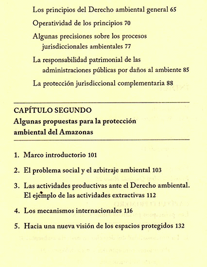 Presentación. -- Introducción. -- Capítulo primero: los principios jurídicos ambientales. -- La funcionalidad del derecho en materia ambiental. -- Precisiones conceptuales y metodológicas. -- El aporte histórico: una nota. -- El desarrollo socioeconómico cualitativo. -- Sobre la naturaleza jurídica del derecho ambiental. -- Los principios generales del derecho ambiental. -- Inflación normativa. -- Los principios del derecho ambiental general. -- Operatividad de los principios. -- Algunas precisiones sobre los procesos jurisdiccionales ambientales. -- La responsabilidad patrimonial de las administraciones públicas por daños al ambiente. -- La protección jurisdiccional complementaria. -- Capítulo segundo: Algunas propuestas para la protección ambiental del Amazonas. -- Marco introductorio. -- El problema social y el arbitraje ambiental. -- Las actividades productivas ante el derecho ambiental. El ejemplo de las actividades extractivas. -- Los mecanismos internacionales. -- Hacia una nueva visión de los espacios protegidos.