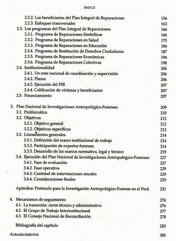El informe de la Comité de la Verdad y Reconciliación consta de nueve tomos de análisis de la violencia vivida en el Perú entre los años 1980 y 2000 y un disco compacto con os anexos. Los nueve tomos que conforman en cuerpo del informe de organizan en los apartados siguientes: