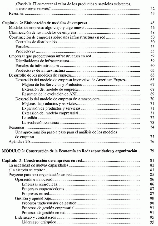 La presente información aquí presentada esta organizada en una introducción, cuatro módulos y una conclusión. el primer modulo esta dirigido a comprender el impacto de las TI en los mercados y las industrias. se discute el tema del posicionamiento estratégico y se explica como las TI del siglo XXI ofrecen oportunidades para cambiar la estructura de los mercados/industrias, el poder y las relaciones. El segundo modulo traslada la atención del entorno externo a la organizacion interna. se exploran las nuevas capacidades, los principios de gestión y las fuentes de valor que se originan en las compañías que trabajan en red.