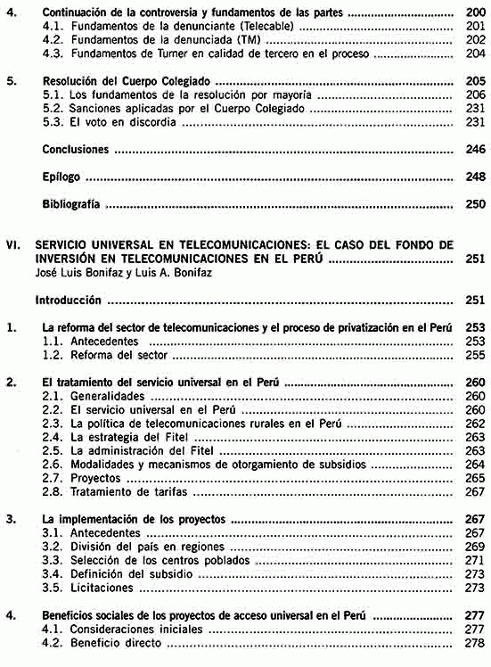 El libro contiene dos casos sobre el sector eléctrico y dos sobre el sector de telecomunicaciones; otro de los ensayos analiza la experiencia frustrada de privatización de Sedapal.