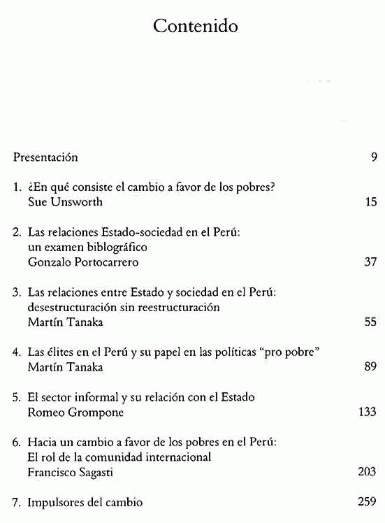 Consta de un conjunto de artículos, la mayoría de ellos escritos por reconocidos estudiosos peruanos por encargo del DFID. La excepción la constituyen los artículos que abren y cierran.