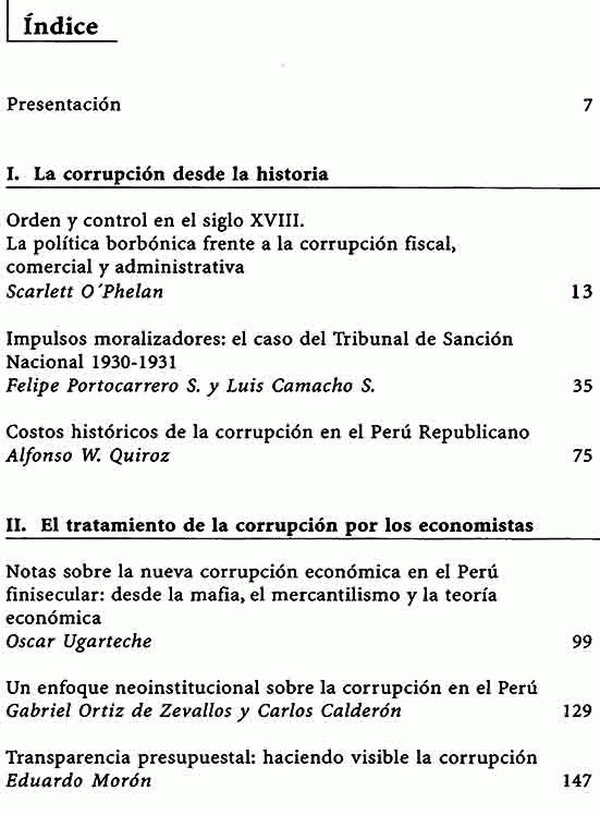 Esta obra esta hecha con el fin de explicar de la exclusiva naturaleza de las practicas corruptas en el Perú, la Red Para Desarrollo de la Ciencias Sociales en el Perú invito a historiadores, economistas, sociólogos, cientistas políticos y abogados para intentar explicar las razones de su persistencia en nuestro país.