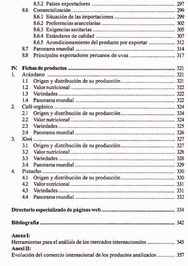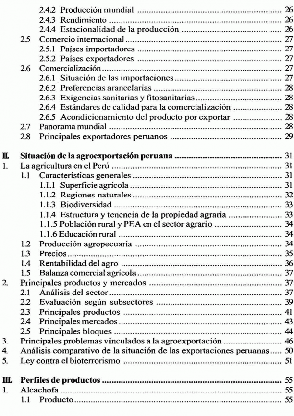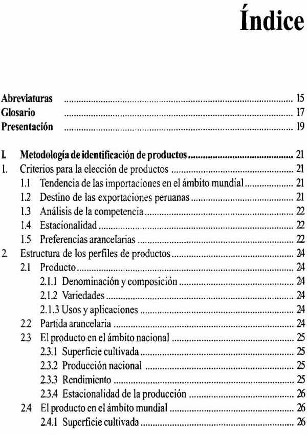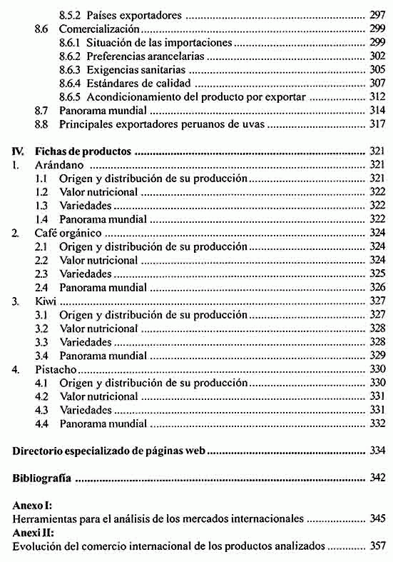 El propósito de este libro es posibilitar el acceso a información que ayude a la toma de decisiones en el campo de la producción, además de proporcionar información especializada de mercados con el propósito de estimular investigaciones complementarias e incluso la elaboración de planes de negocio. (...) La investigación realizada se presenta en cuatro capítulos, estructurados de la siguiente manera: en el capítulo I se presenta la metodología empleada en la identificación de los productos; en el capítulo II se explica la situación de la agroexportación peruana; en el capítulo III se desarrolla fichas de productos que contienen información sobre partidas arancelarias, producción nacional y mundial, zonas de producción, estacionalidades, principales países exportadores e importadores, preferencias arancelarias, condiciones sanitarias y empresas exportadoras locales, entre otras variables; y en el capítulo IV se elabora fichas de productos con potencial de exportación. Se ha incluido también un directorio especializado de páginas web sobre el agro que permitirán al lector ahondar en los temas propuestos.