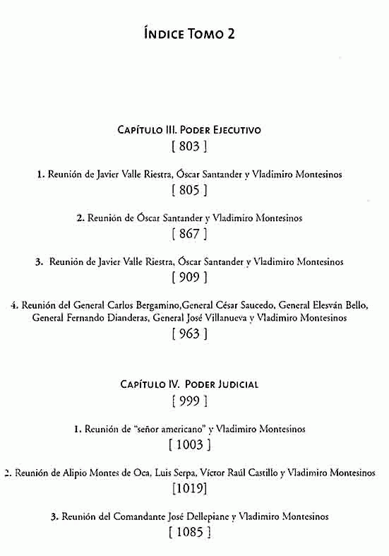 Los seis tomos de la colección en la sala de la corrupción . Audios y videos de Vladimiro Montesinos (1998-2000) muestran a los peruanos y al mundo a uno de los gobiernos más corruptos de la historia del Perú. No hay que dudar, si embargo, que lo que vivimos en las cintas de video era mucho mas que la corrupción de un gobierno. Mucho de la sociedad, de lo que se valora como un segmento mas ilustrado, desfilo por la famosa salida de Montesinos. Empresarios banqueros, magistrados d todo nivel, militares, políticos se descubren que la corrupción esta arraigada en un parte importante de la sociedad.