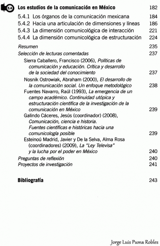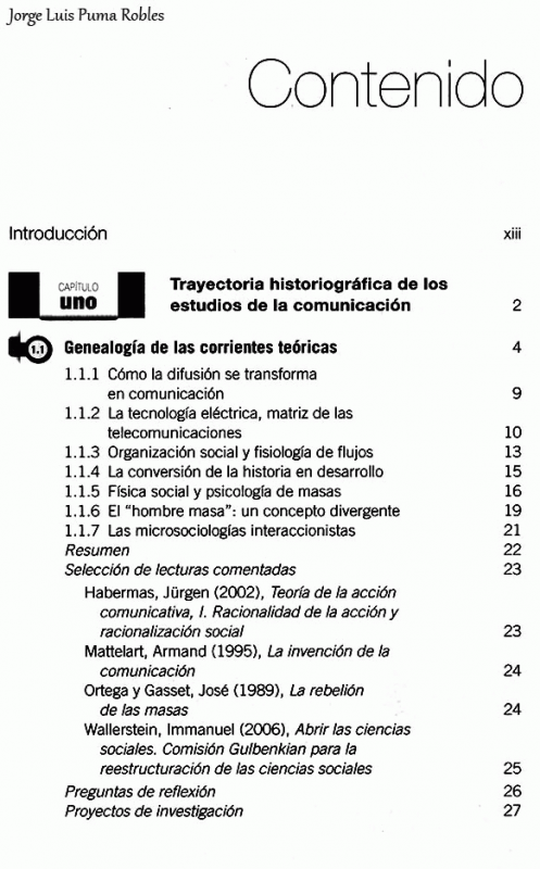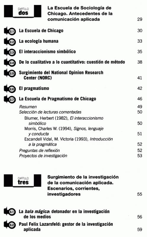 Aborda en cinco capítulos el origen de las microsociologías, el interaccionismo simbólico, la Escuela de Chicago, el pragmatismo, la teoría matemática y el modelos cibernético, la "Escuela Invisible", la escuela de Frankfurt y la escuela lingüística; la economía política crítica, los estudios culturales de Birmingham y los estudios de la comunicación en Estados Unidos, España, América Latina y México.