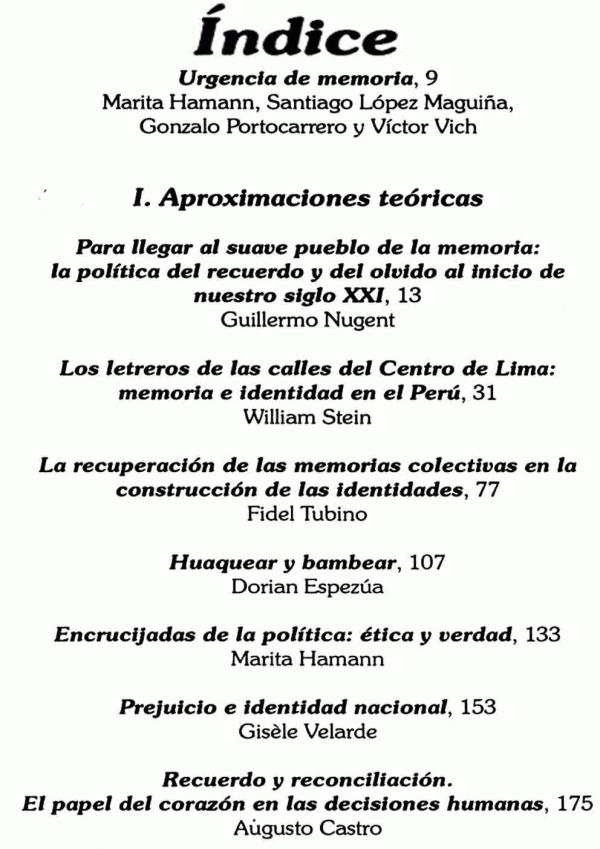 Examina la dinámica de las mutuas exclusiones y la consecuente fragmentación de la sociedad peruana. El círculo del olvido y la repetición. Las dificultades para aprender. Pero también se examinan las luchas por el recuerdo y la integración, por el logro de una sociedad donde la diferencia no evoque la jerarquía sino la equidad. Muestra las heridas del país como el revés de sus posibilidades. El seminario del que resulta este libro congregó a investigadores de diferentes generaciones y disciplinas unidos por la inquietud de responder por qué lo que Basadre llamaba el “querer existencial nacional” no se logra plasmar de manera que la “promesa de la vida peruana” permanece todavía como una virtualidad anhelada.