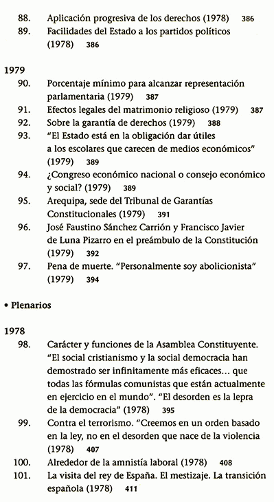 Contiene proclamas de juventud, artículos de análisis nacional, discursos de cátedra y transcripciones de sus intervenciones parlamentarias, y a su lado, muestras del quehacer literario al que también se consagró, con un lirismo nostálgico y terso, el político nacido en Arequipa.