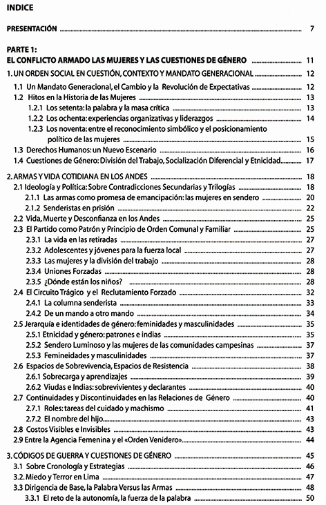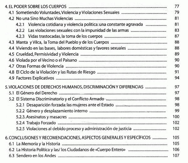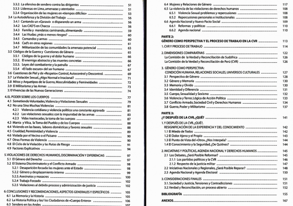 El libro recoge las repercusiones en la memoria colectiva, en los procesos sociales y políticos actuales y la relevancia de la perspectiva de género en el trabajo de la CVR del conflicto armado que vivió el Perú en las décadas del 80 y 90. La publicación incluye tres secciones. En la primera se analizan los acontecimientos que se sucedieron a lo largo del conflicto armado, sobretodo en las vidas de las familias de las comunidades de la sierra y las violaciones de derechos humanos. La segunda estudia el proceso de trabajo y las nociones de género que se tomaron en cuenta en el trabajo de la CVR. La ultima, un breve análisis del contexto actual, que nos remite a las repercusiones de las conclusiones y recomendaciones del informe CVR, los mecanismos de difusión, acogida y resistencia a los mismos y los avances que en materia de iniciativas ciudadanas y políticas publicas se ha producido.