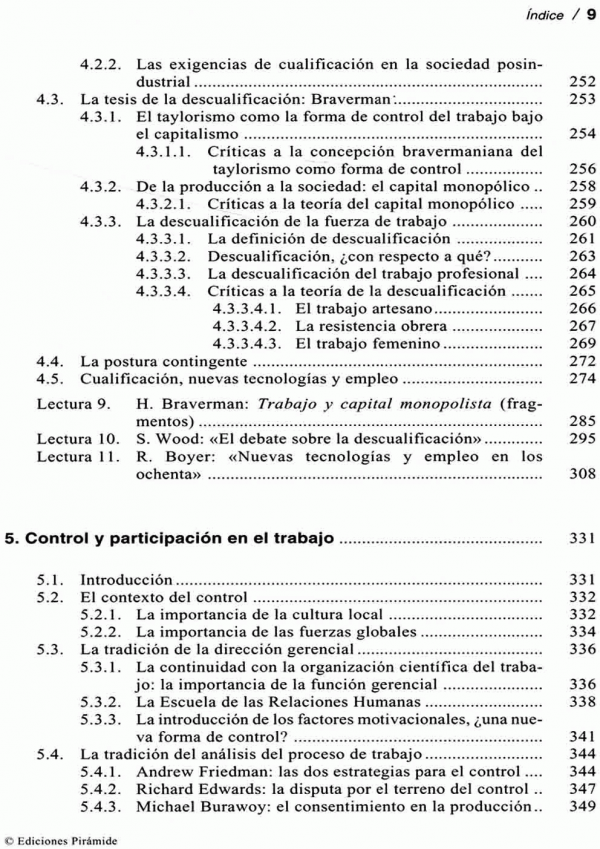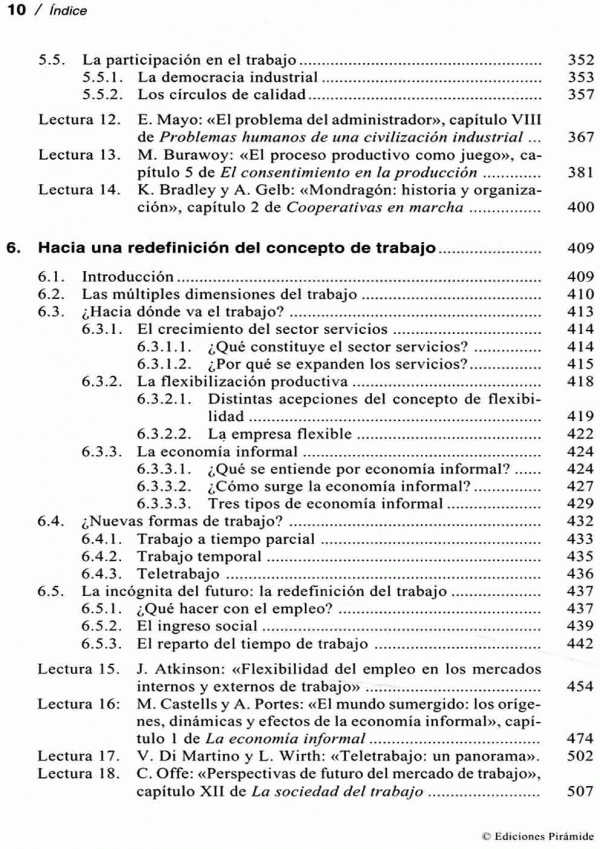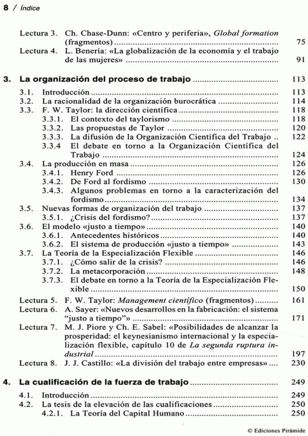 El libro trata algunos de los debates más importantes suscitados en torno al mundo del trabajo. A través de dieciocho contribuciones de autores representativos, tanto clásicos como modernos, y de una documentada introducción a cada uno de los temas, se perfilan las diversas perspectivas teóricas acerca de la organización y reorganización del trabajo. Partiendo de las teorías clásicas, se examinan las interpretaciones en torno a la división internacional del trabajo, las distintas formas de organización, desde el taylorismo al modelo justo a tiempo (just in time), los problemas de la cualificación, el control y la participación de la fuerza de trabajo, para finalmente analizar las tendencias actuales que conducen, de manera inevitable, a una redefinición del concepto de trabajo. En cada capítulo se incluyen lecturas ilustrativas de los temas tratados, cuyos autores son: Marx, Durkheim, Chase-Dunn, Benería, Taylor, Sayer, Piore, Sabel, Castillo, Braverman, Wood, Boyer, Mayo, Burawoy, Bradley, Gelb, Atkinson, Castells, Portes, Di Martino, Wirth y Offe. En esta selección se han tenido en cuenta dos objetivos, poner al lector en contacto directo con las fuentes y estimular un conocimiento reflexivo.Independientemente de su utilidad en el ámbito universitario, este libro interesará sin duda a todos aquellos profesionales preocupados por algunos de los problemas más acuciantes que afectan a las sociedades de nuestro tiempo.