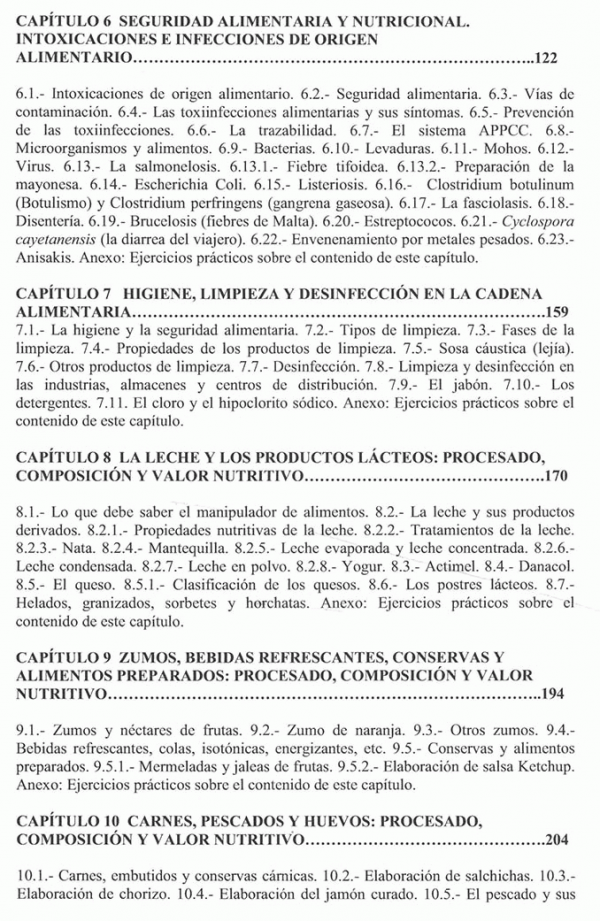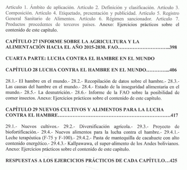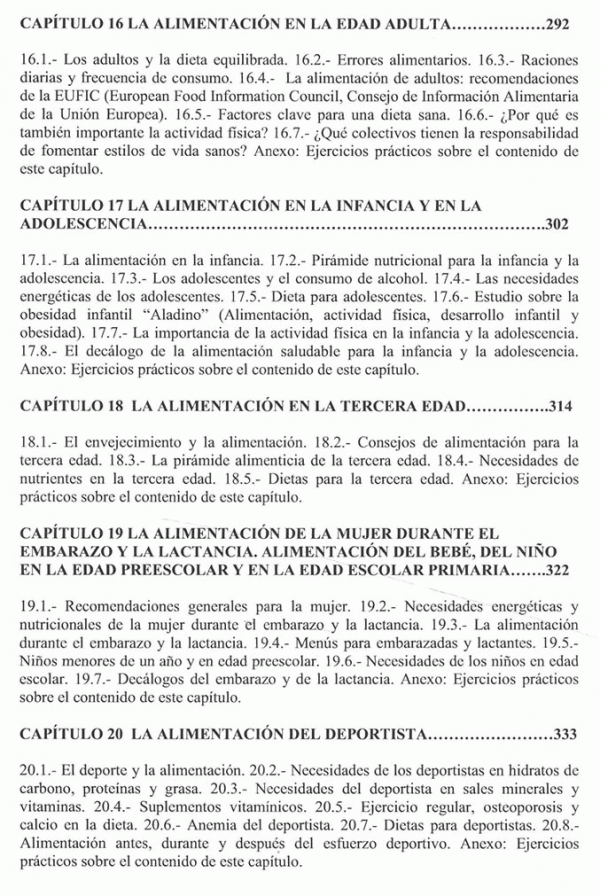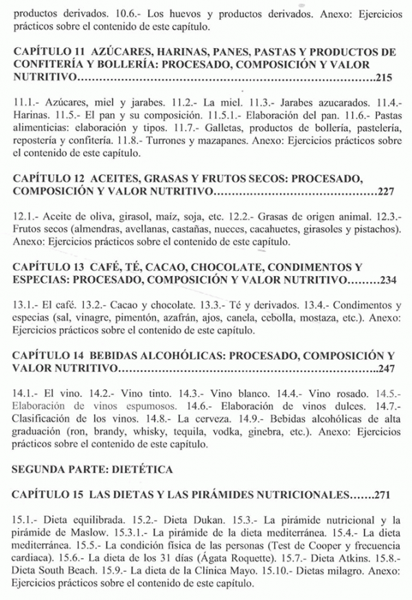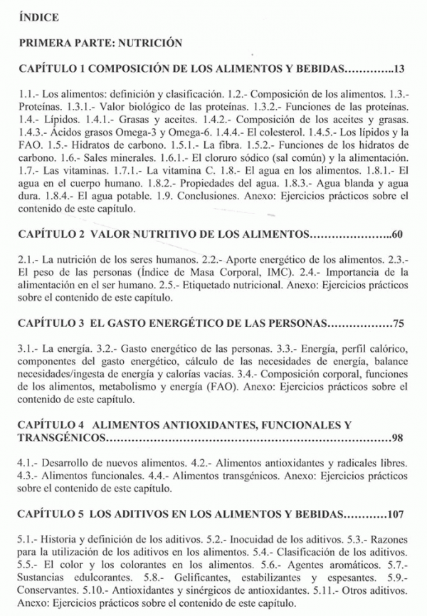 Consta de varias partes: 1ª parte. NUTRICIÓN. Se presentan los conocimientos más actuales relativos a los alimentos, su composición, propiedades, su valor nutritivo, el gasto energético de las personas, los aditivos en los alimentos, el etiquetado nutricional, el peso de las personas (Índice de Masa Corporal, IMC), alimentos funcionales, transgénicos, antioxidantes, ácidos grasos omega-3, probióticos, prebióticos, la seguridad alimentaria y nutricional, etc. Se hace también un estudio de cada alimento concreto: leche, queso, yogur, carnes, embutidos, pescados, mariscos, grasas, aceites, zumos, mermeladas, néctares, huevos, azúcares, harinas, panes, pasteles, cacao, chocolate, caramelos, turrones, galletas, salsas, frutos secos, miel, café, té, vino, cerveza, licores, etc. También se trata el asesoramiento nutricional con casos prácticos. 2ª parte. DIETÉTICA. Se estudian a fondo los distintos tipos de dietas tales como la mediterránea, vegetariana, china, japonesa, modificadas en proteínas (la dieta Dukan, por ejemplo), modificadas en hidratos de carbono, ricas en fibra, pobres en sodio, pobres en colesterol, etc. Después se estudian las dietas para deportistas, tercera edad, adultos, adolescencia, embarazo, lactancia, etc. En ciertas enfermedades las dietas que se dan a los pacientes son muy importantes en el tratamiento. Por ello en esta segunda parte del libro se estudian las dietas para enfermos de cáncer, diabetes, problemas cardiovasculares, obesidad, anorexia, bulimia, etc. 3ª parte. LEGISLACIÓN. También se reserva un espacio para la legislación, con la inclusión de la reglamentación técnico-sanitaria de los productos alimenticios destinados a ser utilizados en dietas de bajo valor energético para reducción de peso, se trata todo el asesoramiento dietético con casos prácticos, etc. 4ª parte. EL HAMBRE EN EL MUNDO. Se trata en los últimos capítulos del libro la lucha contra el hambre y la desnutrición en el mundo. Se tratan las medidas a tomar, como preparación de nuevos alimentos, cultivos urbanos, etc. La amplia cantidad de ilustraciones hace del libro una obra muy didáctica. Es un libro de gran interés para farmacéuticos, médicos, dietistas y nutricionistas, herbolarios, tiendas especializadas, industrias agroalimentarias, expertos en tecnología de alimentos, responsables de comedores colectivos (colegios, empresas, restaurantes, cafeterías), cursos de formación, enseñanza, institutos, etc.
