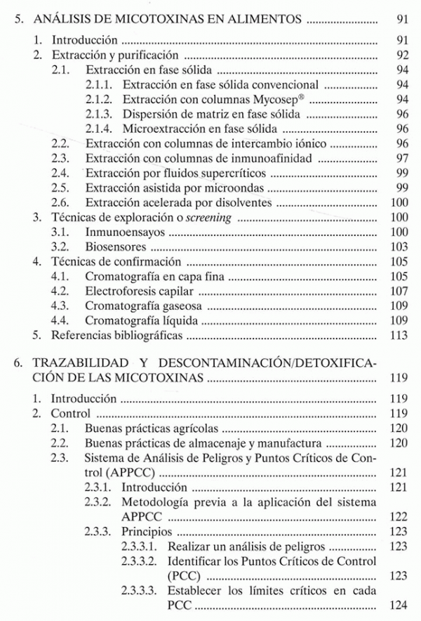 Las micotoxinas son sustancias producidas por determinados hongos filamentosos como producto de su metabolismo secundario. Estos metabolitos pueden contaminar los alimentos o los piensos, o las materias primas utilizadas para su elaboración, originando un grupo de trastornos y enfermedades, denominadas micotoxicosis, y que resultan tóxicos para el hombre y los animales. Hoy en día se considera que un 25% de las cosechas mundiales de cereales se encuentran intoxicadas por micotoxinas. El libro, cuenta con grandes especialistas en el campo de la micotoxicología de todo el mundo, estructurándose en dos partes. La primera parte aborda aspectos generales como son la toxicidad y evaluación de riesgos , las especies productoras de micotoxinas , los factores determinantes en la producción de estos compuestos, así como un repaso general sobre las técnicas analíticas, las medidas de control de calidad, descontaminación/d! etoxificación y los aspectos legislativos. La segunda parte trata de cada una de las principales micotoxinas, profundizando en las características, toxixología, incidencia, ingesta diaria y los principales métodos de descontaminacion.