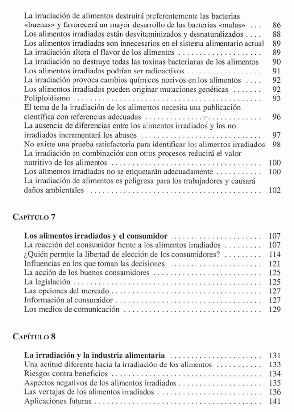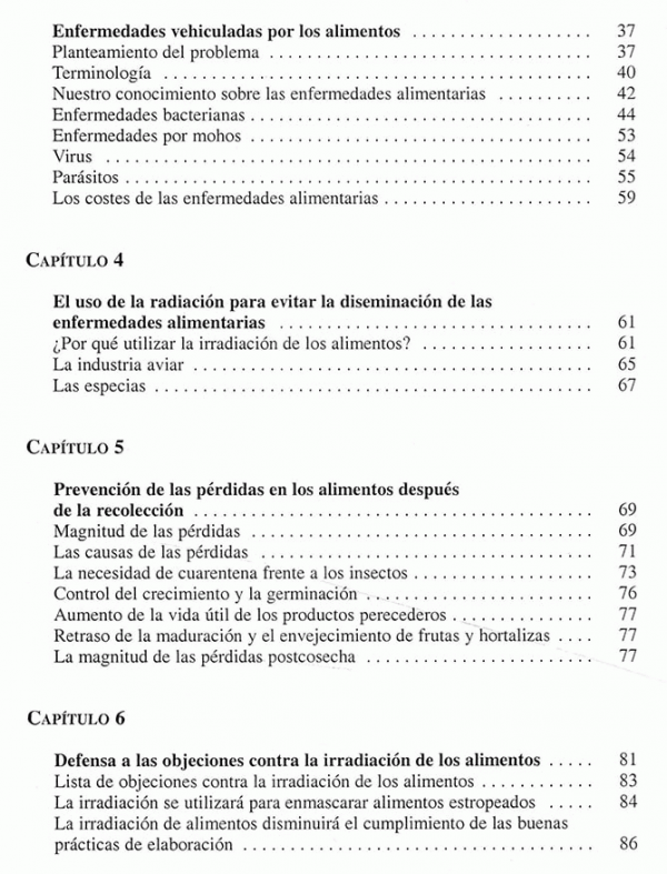 La irradiación de los alimentos. La pasteurización. Enfermedades vehiculadas por los alimentos. El uso de la radiación para evitar la diseminación de las enfermedades alimentarias. Prevención de las pérdidas en los alimentos después de la recolección. Defensa a las objeciones contra la irradiación de los alimentos. Los alimentos irradiados y el consumidor. La irradiación y la industria alimentaria.