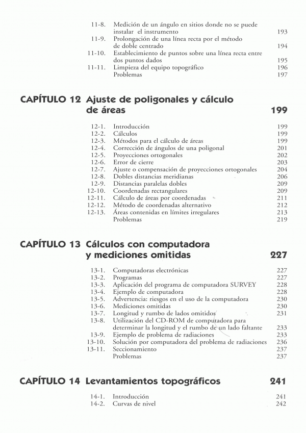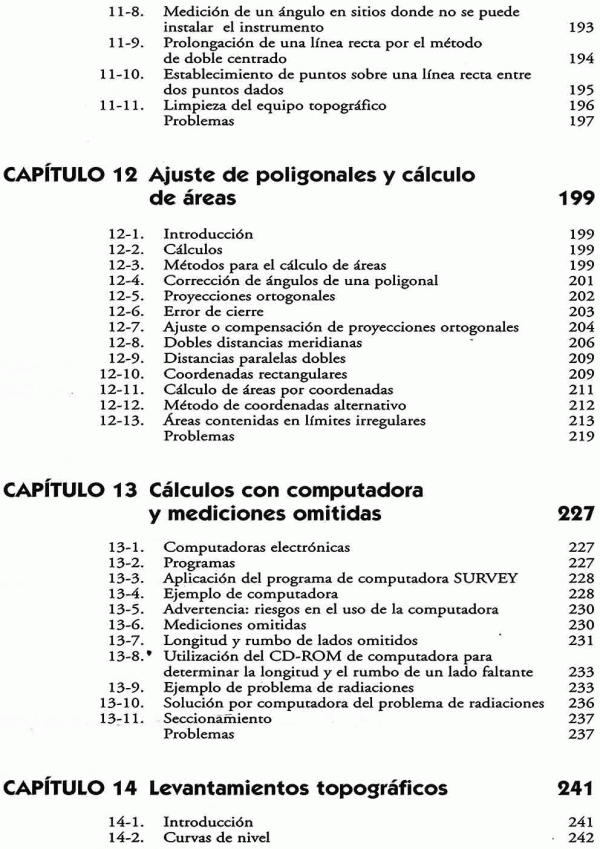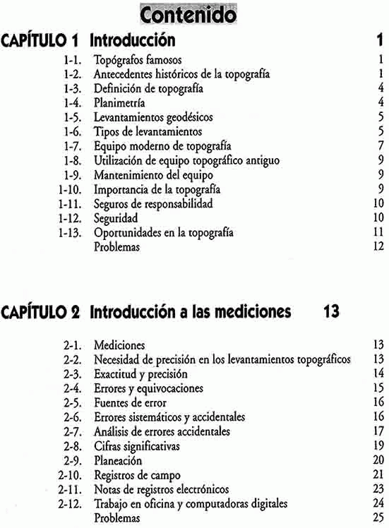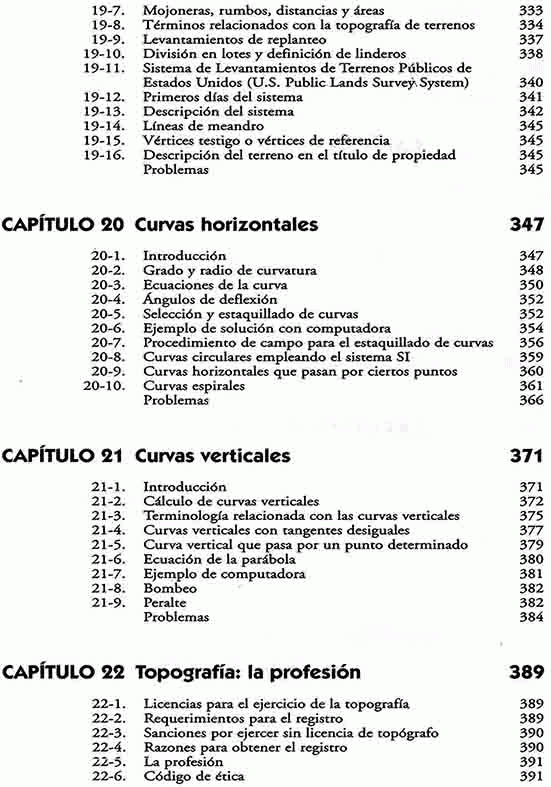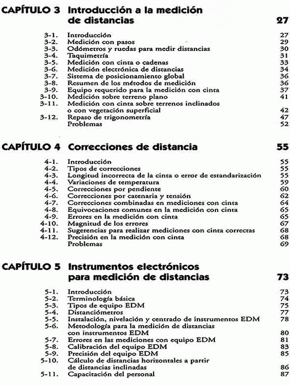 Topografía - Mediciones - Planeación - Corrección de distancias - Instrumentos electrónicos para medición de distancias - Nivelación diferencial - Ángulos y direcciones - Ajuste de poligonales y cálculo de áreas - Levantamientos topográficos - Sistema de posicionamiento global - Topografía aplicada a la construcción - Volúmenes - Curvas horizontales y verticales.